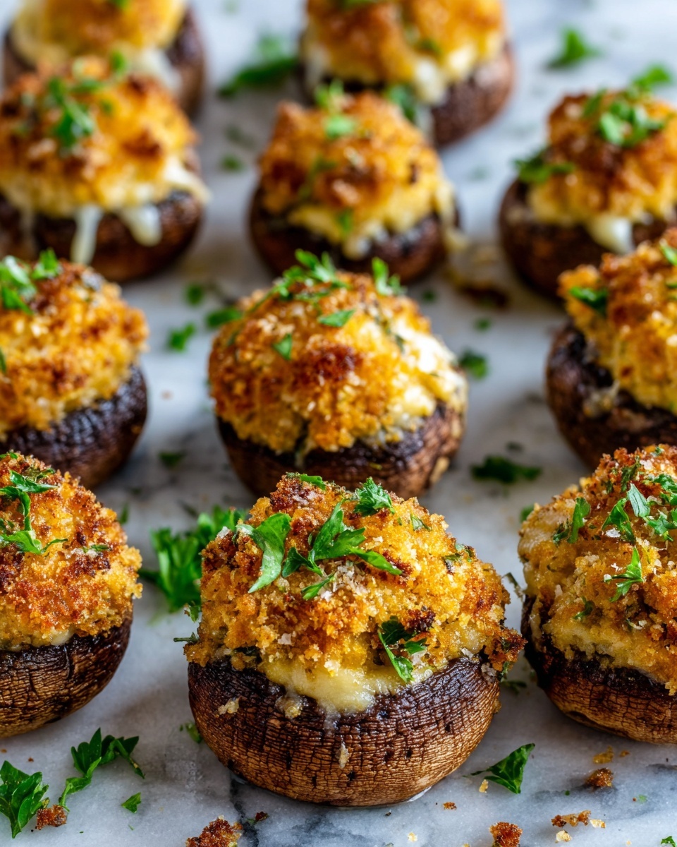Present these mushrooms on a rustic wooden board or a sleek serving platter for an inviting look. You might place each mushroom in a mini lettuce leaf for a delicate bite or decorate the plate with edible flowers or microgreens to enhance the presentation for special occasions. The filling also works as a dip if scooped out, making it versatile for different serving styles.
