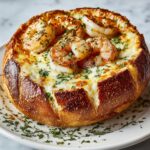 A deliciously creamy and cheesy stuffed seafood bread bowl featuring shrimp, crab meat, and scallops in a luscious garlic cream sauce, baked to golden perfection inside a crusty artisan bread bowl. Perfect for sharing and serving as a hearty appetizer or main course.