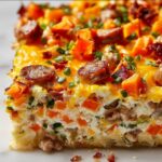 This Sweet Potato Hashbrown Breakfast Casserole is a hearty and flavorful morning dish combining tender sweet potatoes, savory sausage, colorful vegetables, and a rich egg and cheese mixture. Baked to golden perfection, it offers a satisfying and nutritious start to your day, perfect for feeding a crowd or meal prepping for the week.