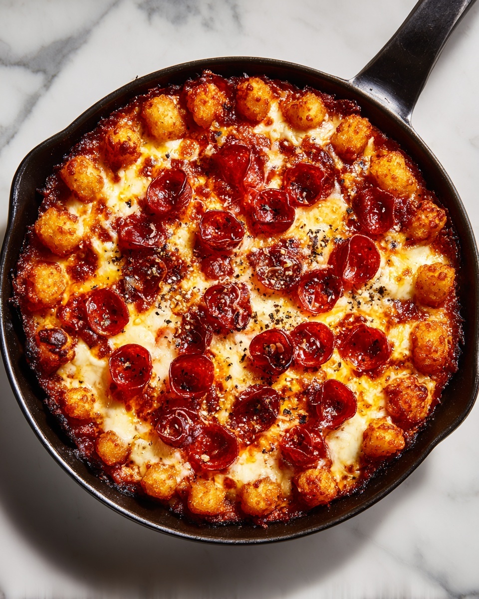 - Flatten the Crust: Remove the skillet from the oven and gently press down the crispy tater tots with a spatula or flat-bottomed glass to form a flatter, more cohesive pizza crust.
