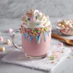 - Serve and garnish: Pour the hot chocolate into mugs. Generously top each cup with whipped cream, pastel sprinkles, and mini marshmallows. Optionally, sprinkle with a pinch of edible glitter for a magical sparkle. For extra fun, add cotton candy or candy hearts as a creative garnish. Serve immediately to enjoy the vibrant colors and creamy flavors.