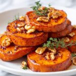 This Walnut Maple Roasted Sweet Potatoes recipe offers a deliciously sweet and nutty side dish, featuring tender roasted sweet potato slices glazed with a caramelized maple syrup and walnut topping, enhanced with cinnamon and thyme for a cozy, flavorful experience perfect for any meal.